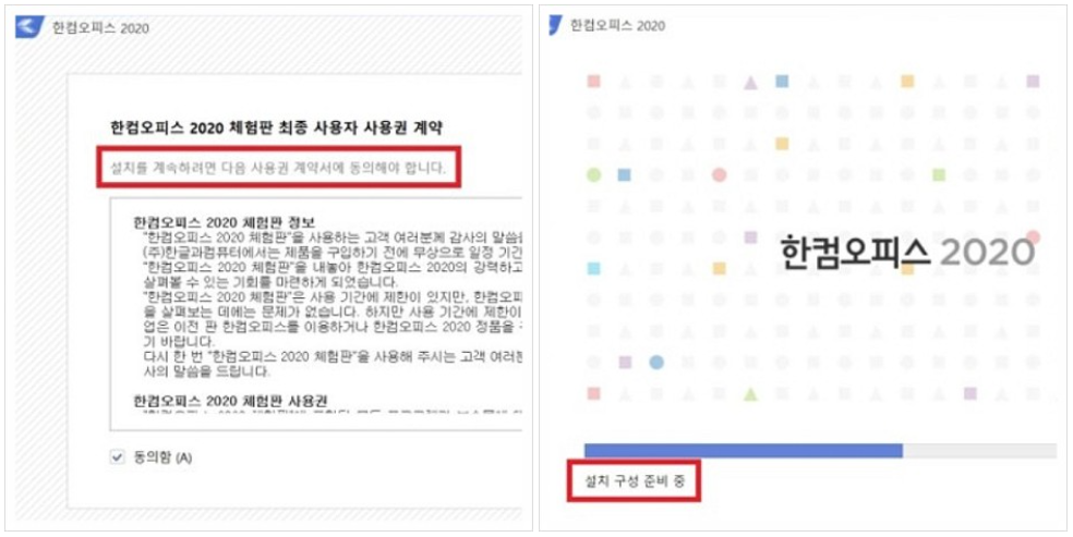 약관을 확인하고 동의 체크 후 설치가 바로 진행이 되었네요. 가정에서도 많이 사용을 하지만 관공서나 정부기관 또는 일반기업에서도 한글표준문서 형식을 따라 다양한 문서를 작성할 때 사용을 하는 것이 바로 한글오피스죠. 혼자서 문서 작성을 할 때 뿐만 아니라 클라우드 기반으로 협업을 할 때에도 쓸 수 있어 최근 각광 받는 프로그램이라고 하더라고요.